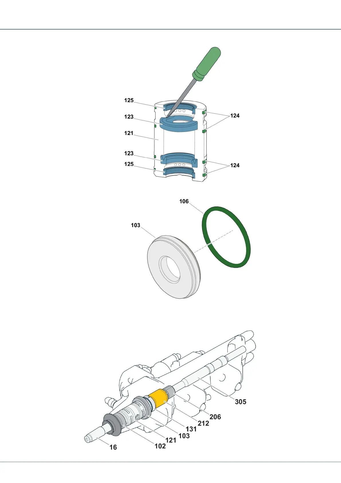 Use a pointed tool to remove the O-ring (106) carefully from the washer(103).