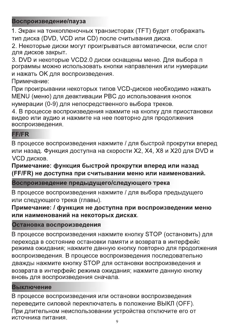 eplutus EP-9518T - FF;FR; Воспроизведение предыдущего;следующего трека; Остановка воспроизведения; Выключение