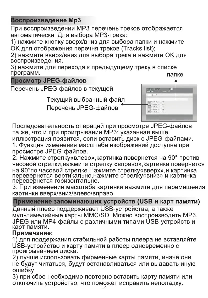 eplutus EP-9518T - Воспроизведение Мр3; Просмотр JPEG-файлов; Применение запоминающих устройств (USB и карт памяти)