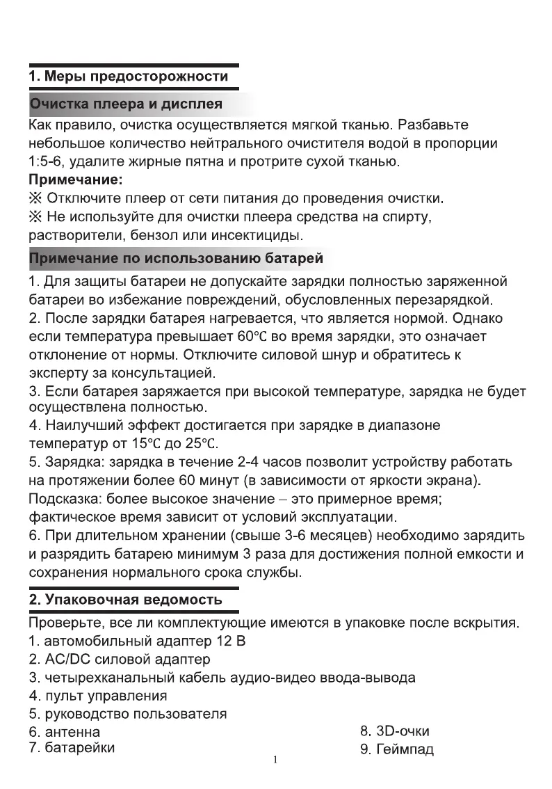 eplutus EP-9518T - Меры предосторожности; Очистка плеера и дисплея; Примечание по использованию батарей; Упаковочная ведомость