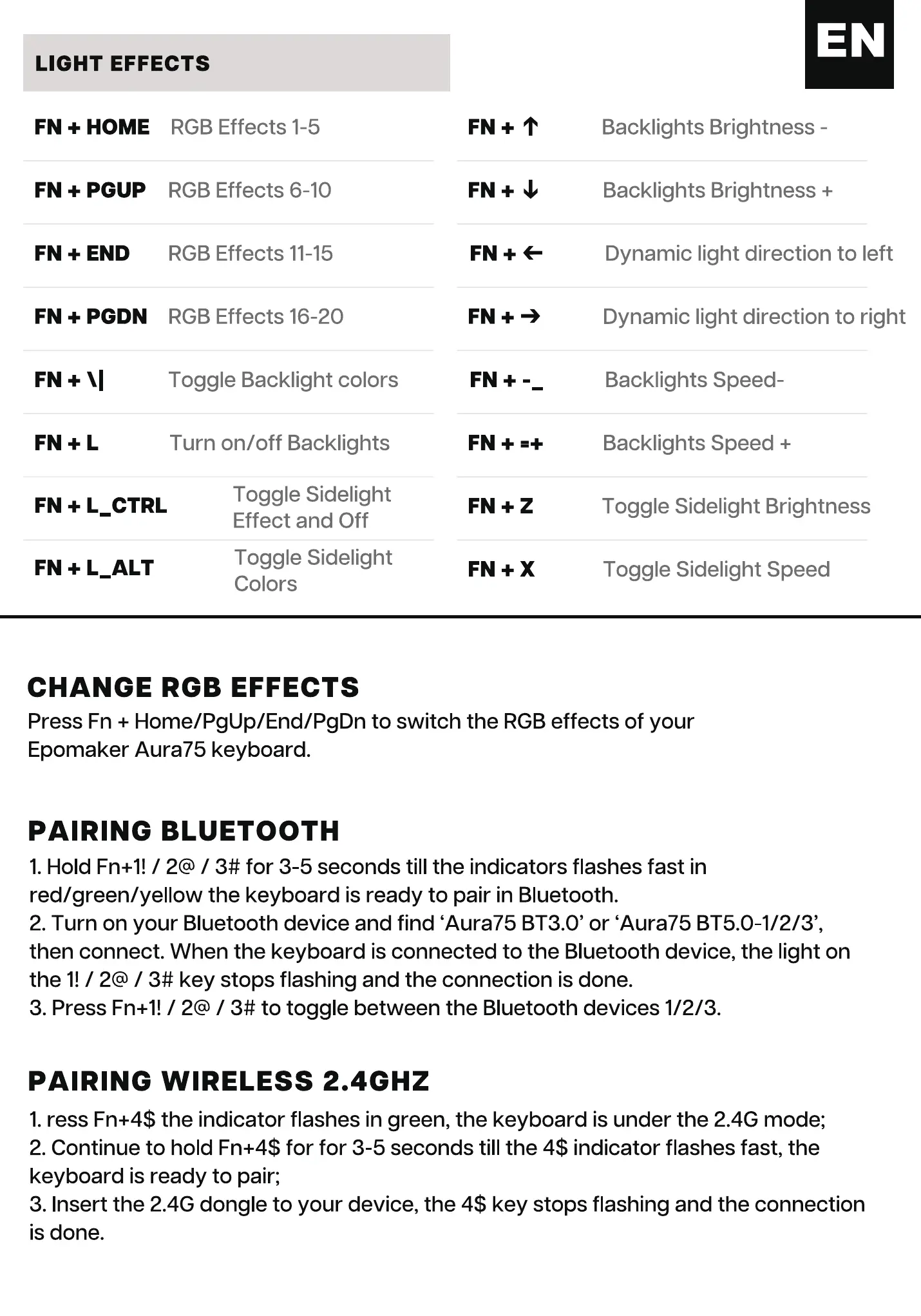 1. ress Fn+4$ the indicator flashes in green, the keyboard is under the 2.4G mode;