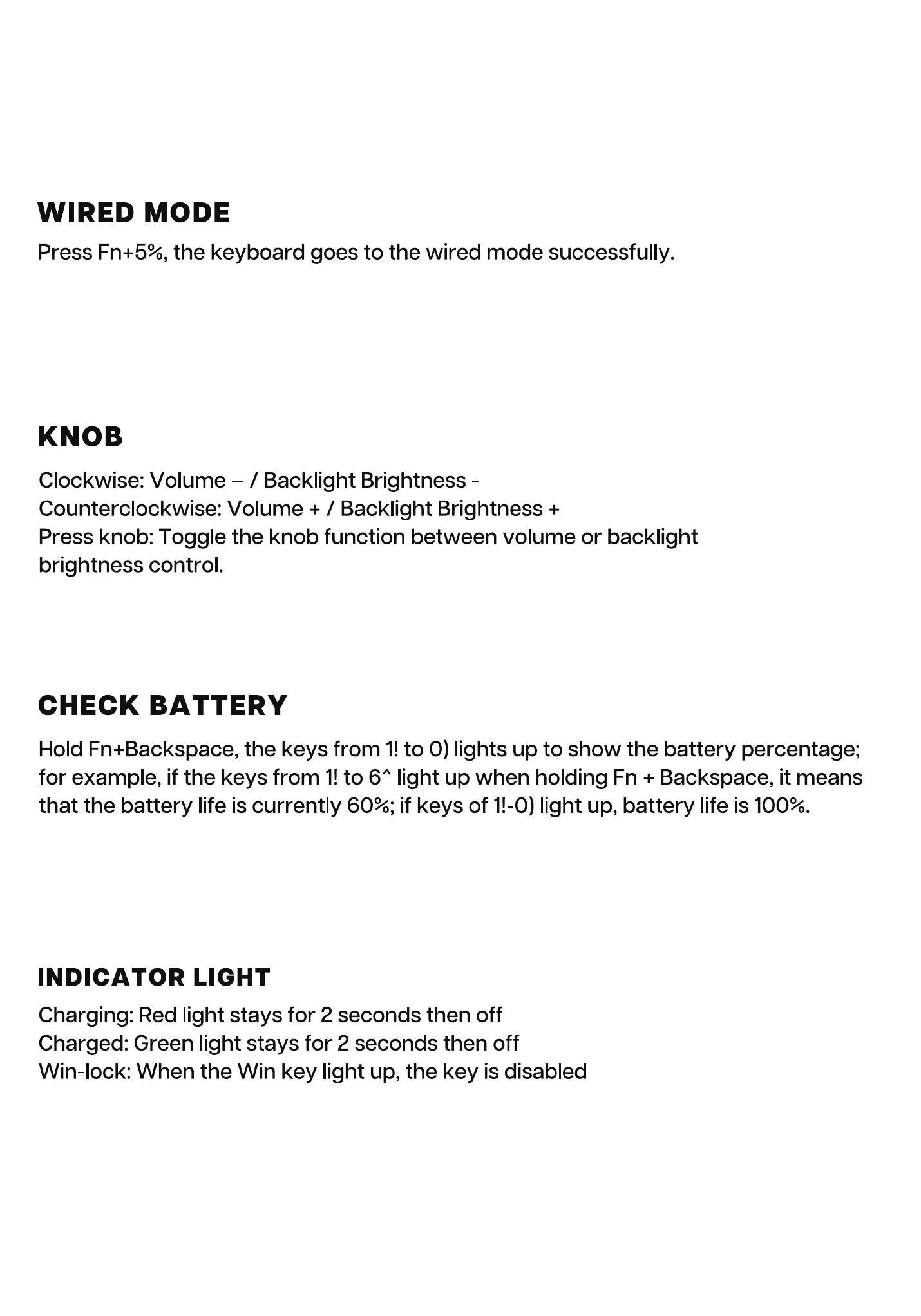 Hold Fn+Backspace, the keys from 1!to O) lights up to show the battery percentage;