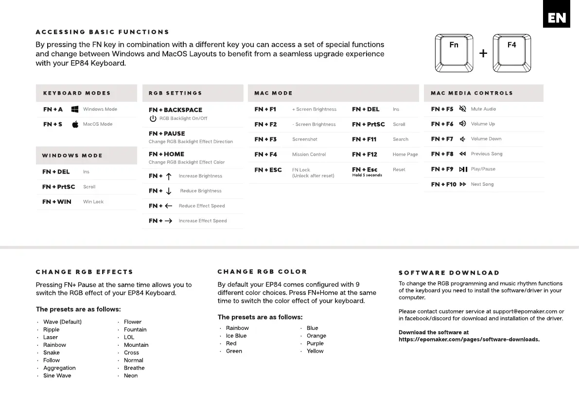 Epomaker EP84 - Windows Shortcuts; Windows Mode Switching; macOS Shortcuts; macOS Mode Switching