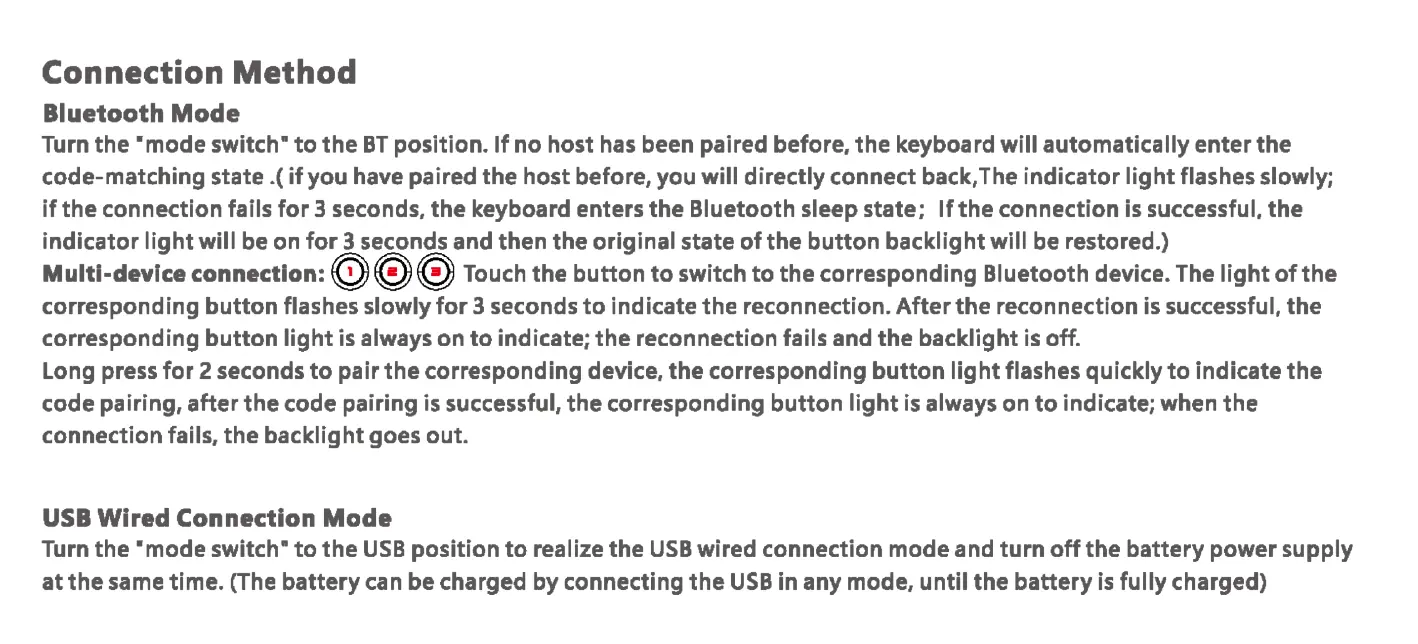 if the connection fails for 3 seconds, the keyboard enters the Bluetooth sleep state; Ifthe connection is successful, the
