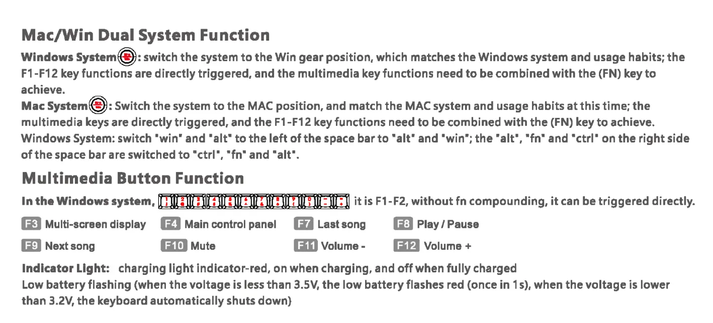 multimedia keys are directly triggered, and the Fl -Fl 2 key functions need to be combined with the (FN) key to achieve.