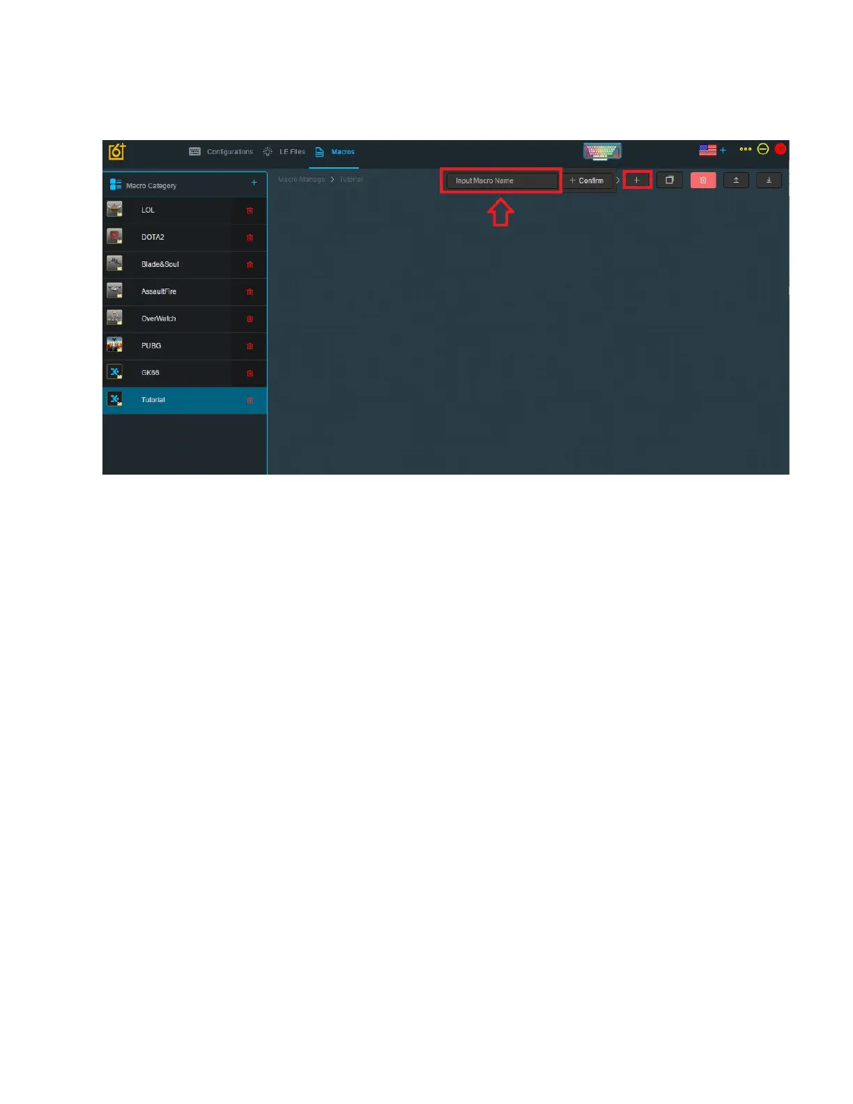 1. Click the “+” Button the the left and enter your desired Macro name, then press Confirm.