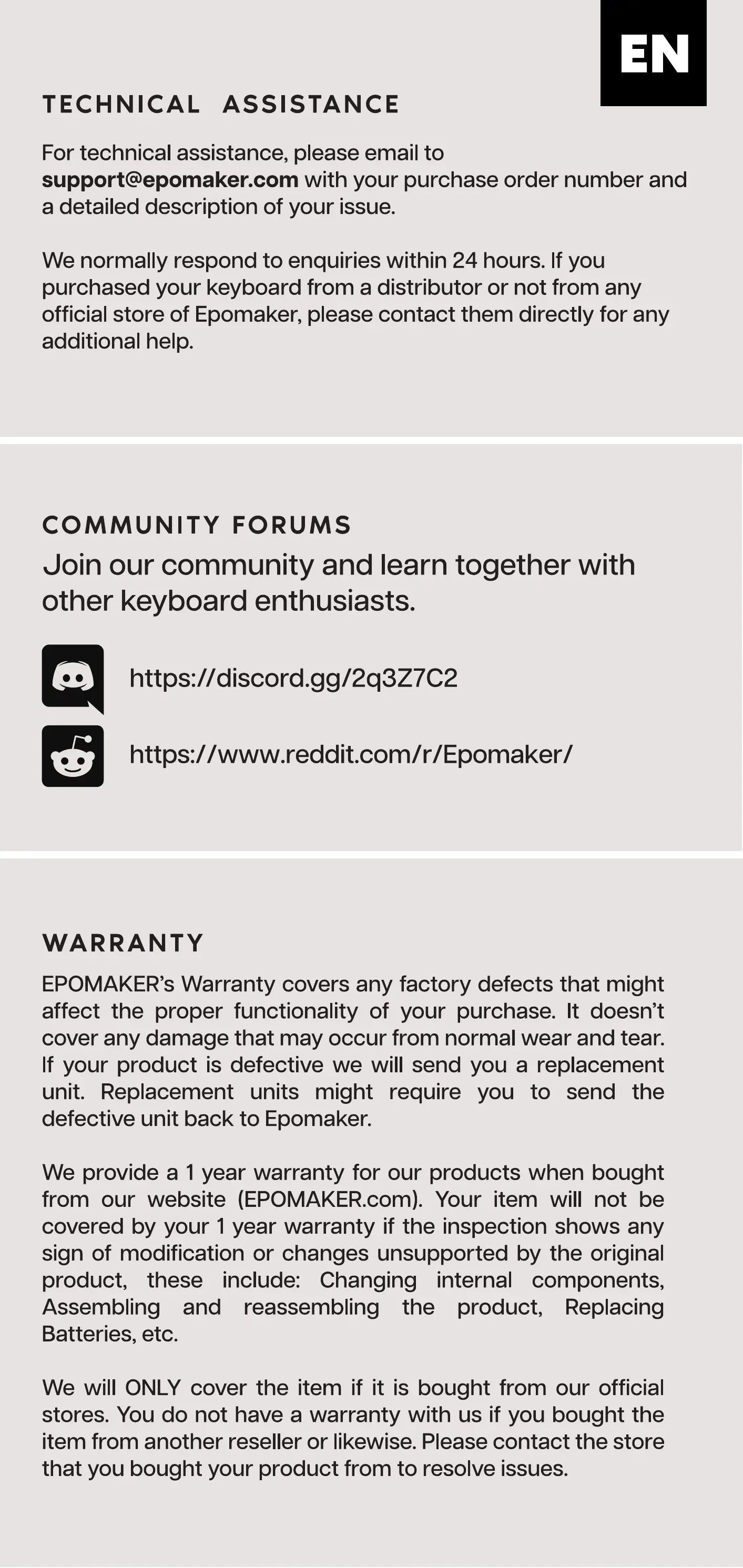 EPOMAKER's Warranty covers any factory defects that might