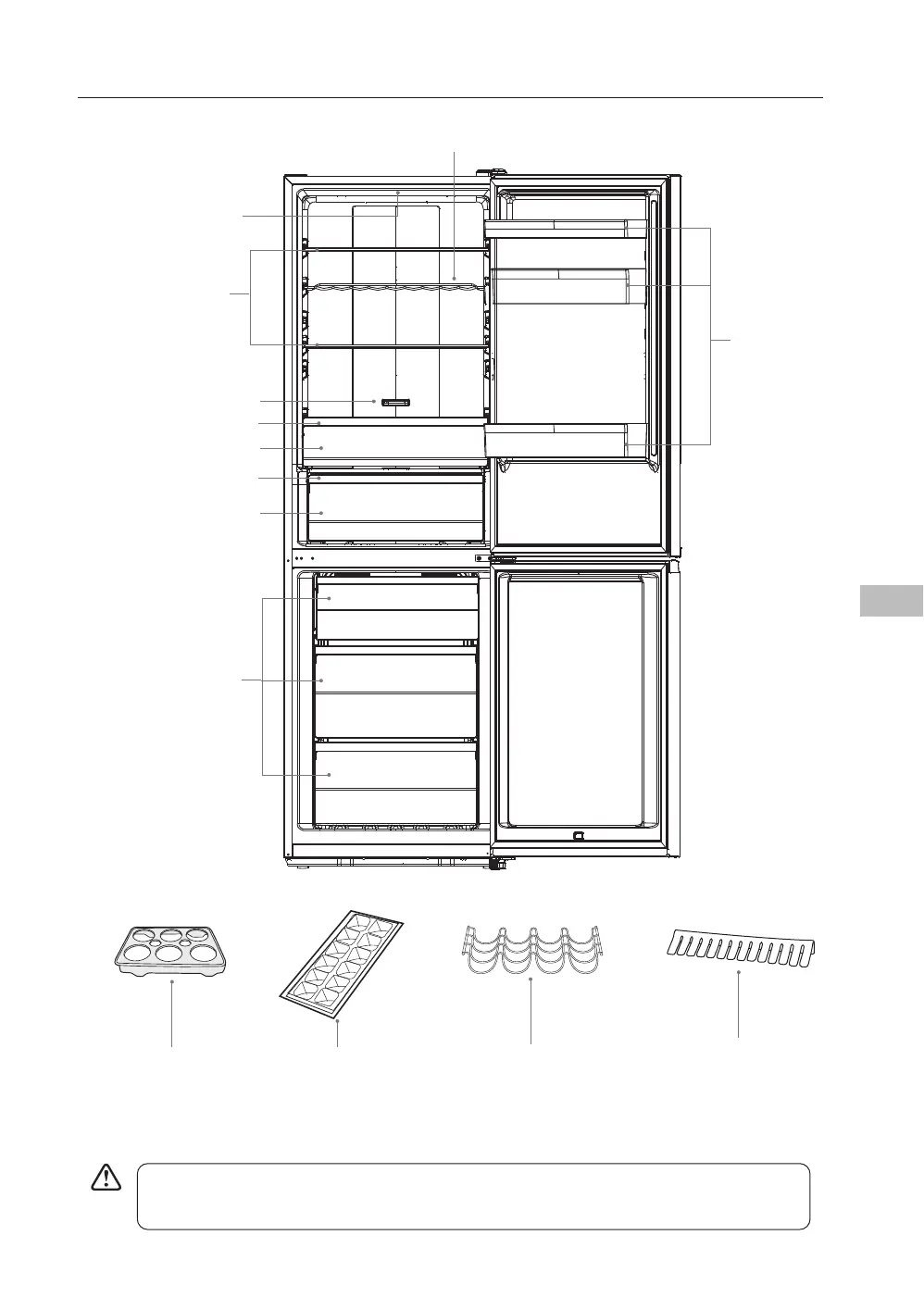 Kaikki lisävarusteet, kuten vetolaatikot, hyllyt ja lokerot, tulee asentaa, kuten tässä