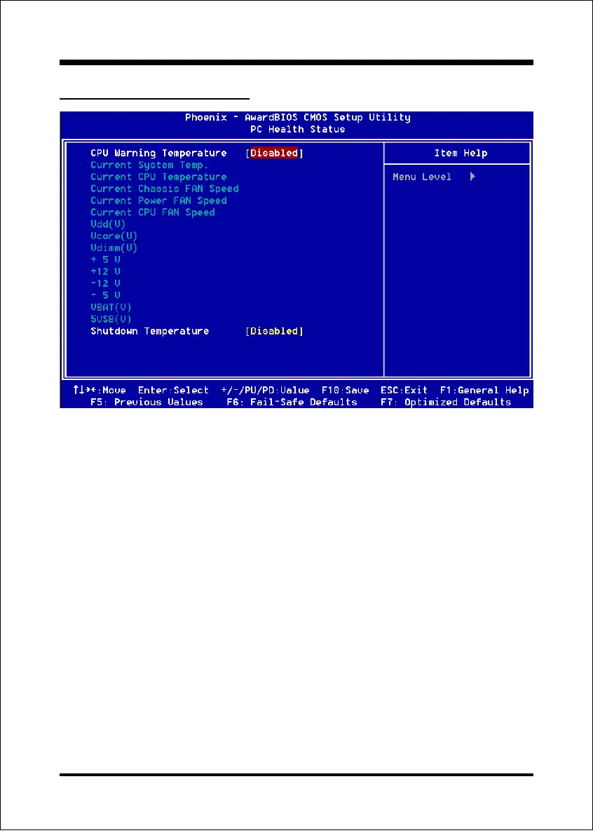 Displays the current speed of the CPU, chassis, and power fan speed in RPMs.