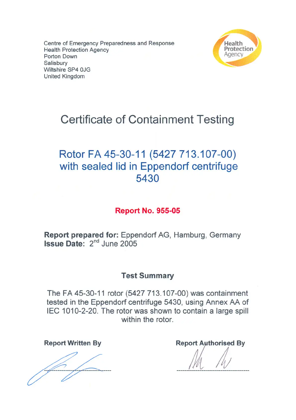 Eppendorf 5430 - Containment Testing Certificates; Rotor FA 45-30-11 Containment Test
