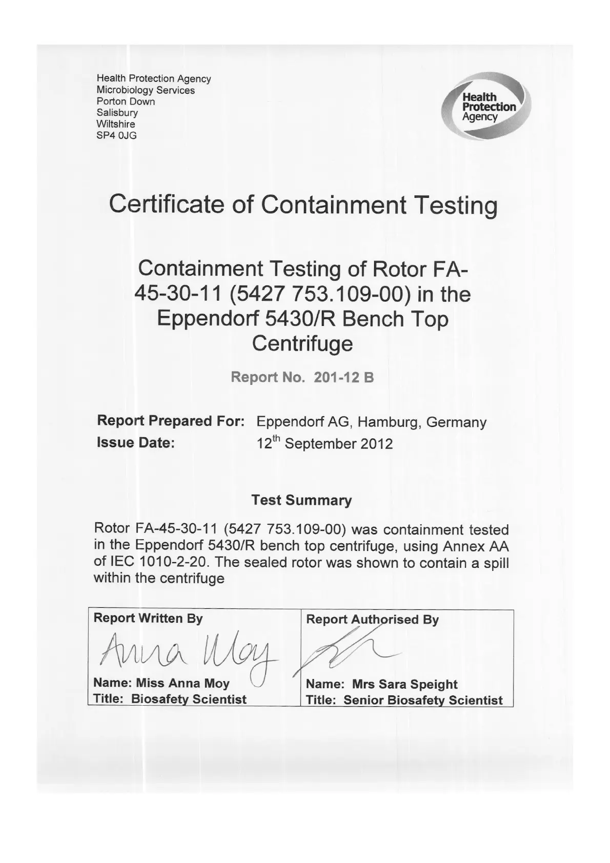Eppendorf 5430 - Rotor FA-45-30-11 Containment Test