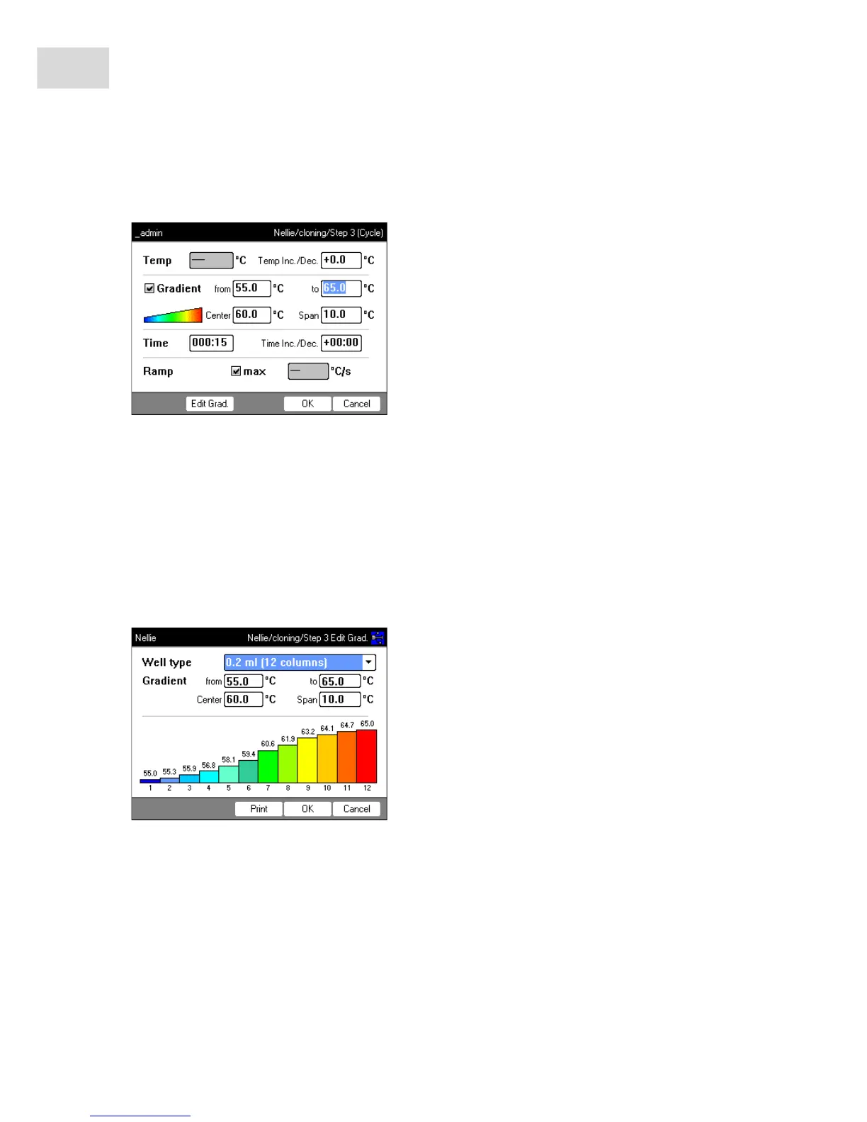 5. Optional: press the Edit Grad. softkey to display the resulting temperatures in the block columns.