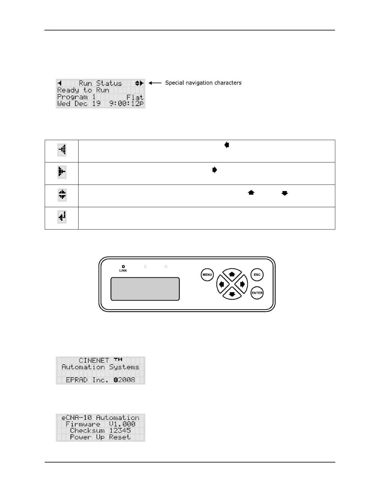 Special characters are displayed to aid in the navigation of the screens. The characters are described