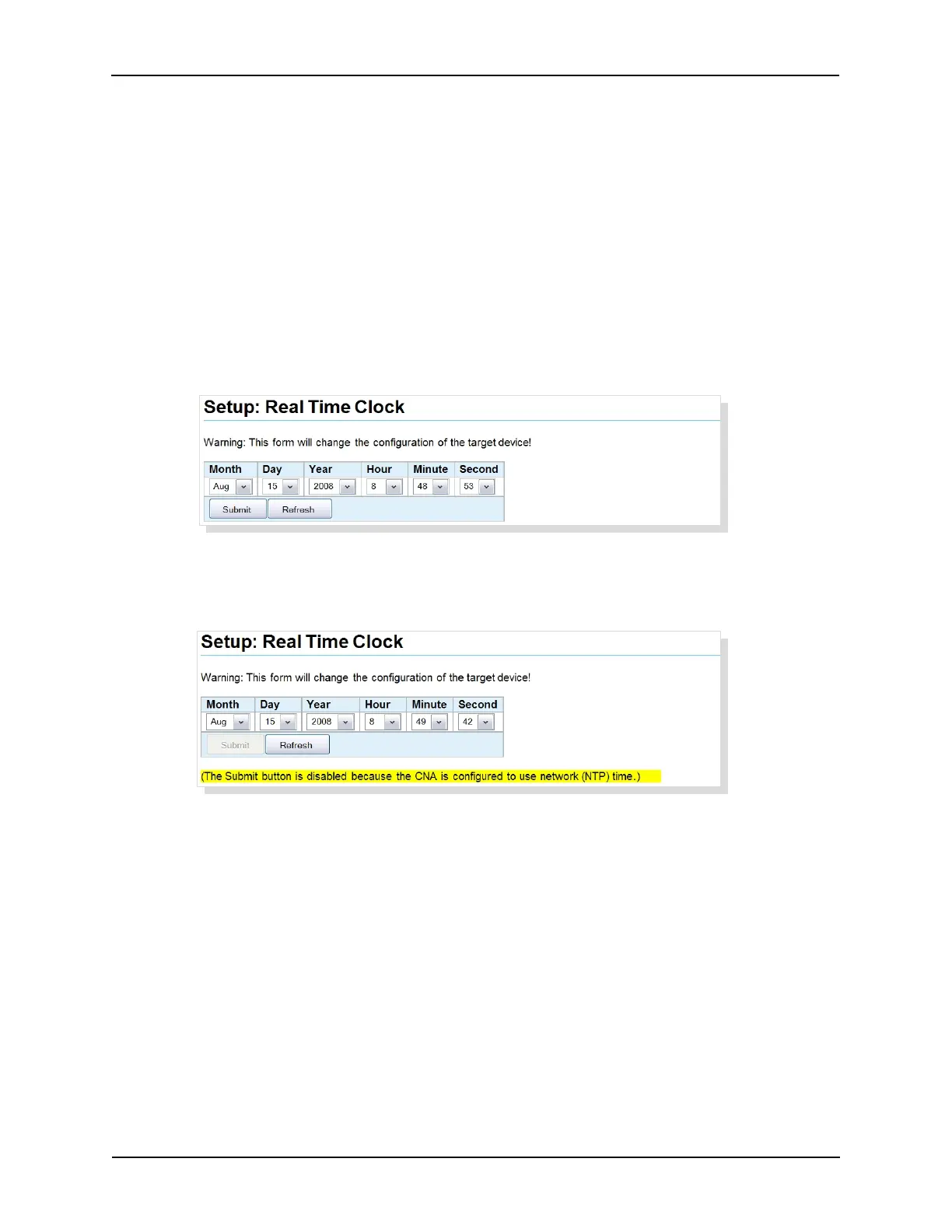 If the eCNA-10 is configured to use network (NTP) time, the Submit button is disabled and the clock