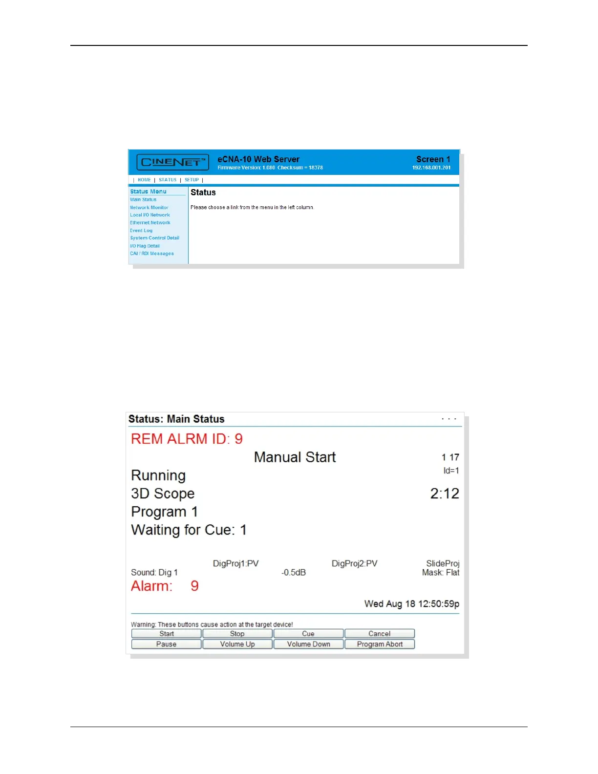 Click on Main Status in the Status Menu. This screen displays information during and between shows