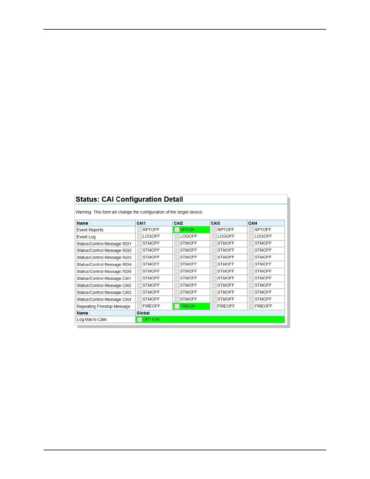 Click on CAI Configuration Detail in the Status Menu. This screen shows the status of the individual