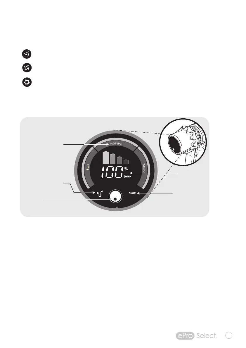 Use the SELECTION button to choose from 3 Suction Modes: ECO, NORMAL, TURBO.