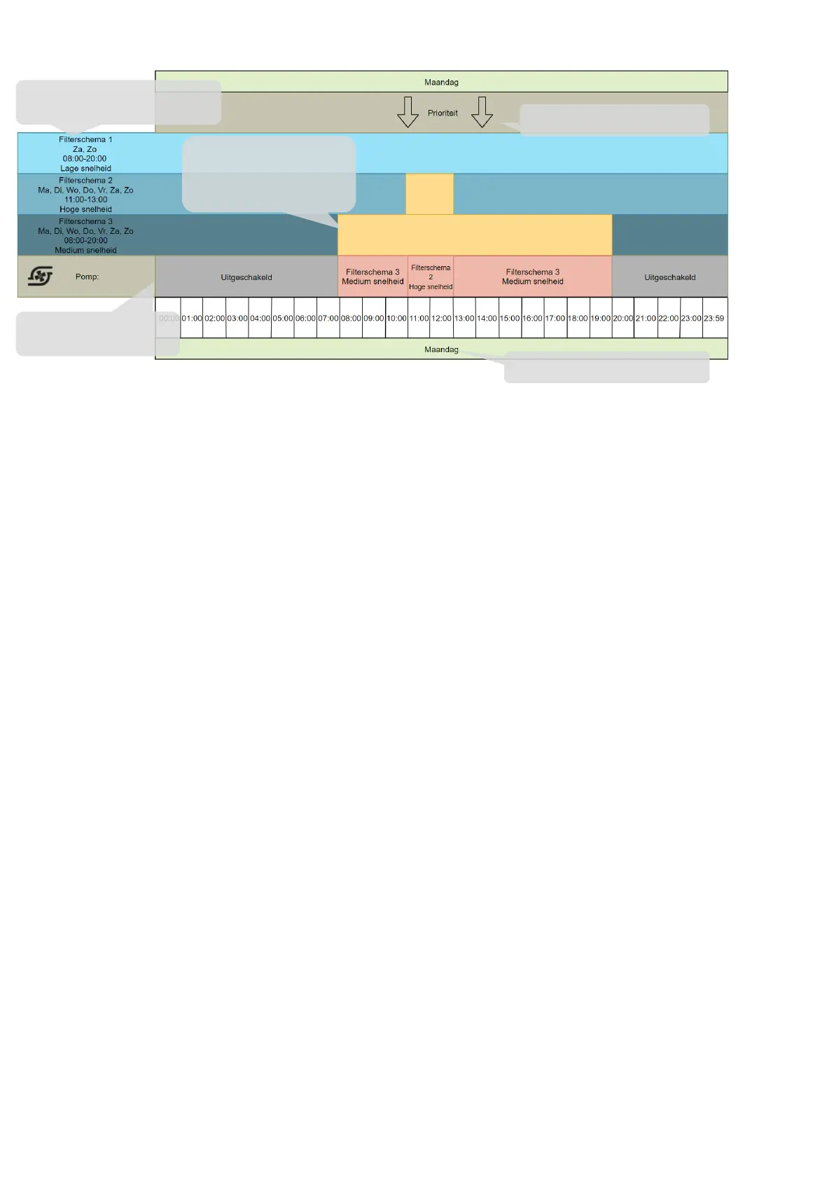 have any effect, filter schedule 2 has a higher priority. At 14:00, the pump will follow filter schedule 3 again because filter schedule