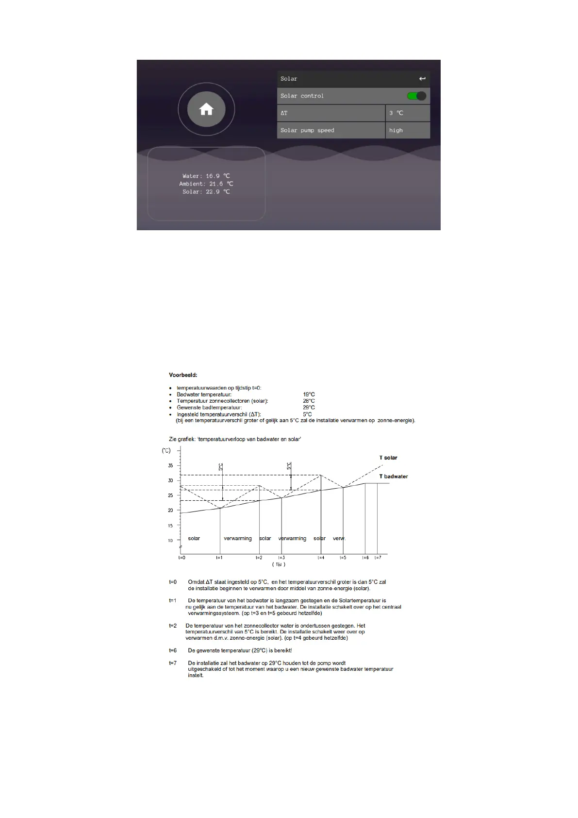 The pool water will be heated with the solar to the set pool water temperature when this control is switched on. The user can therefore turn