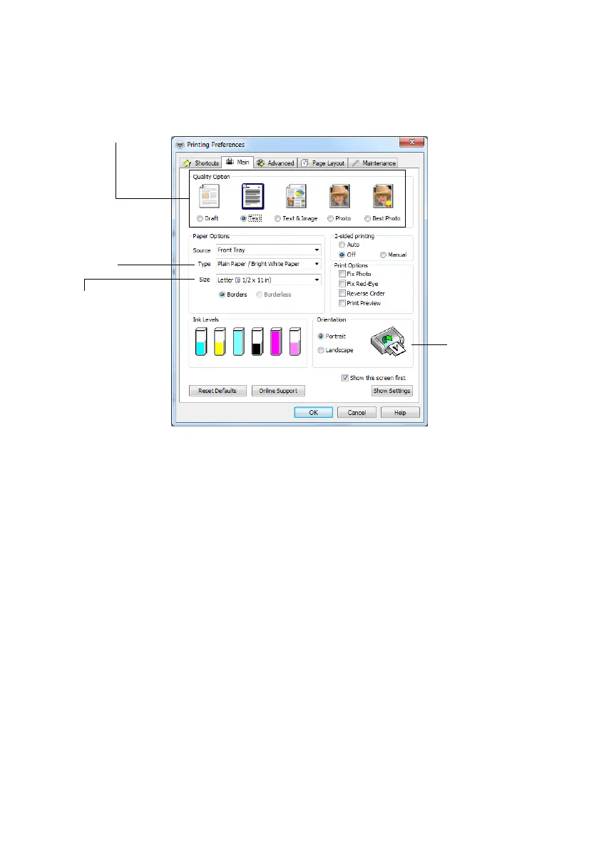 3. On the Main tab, select the basic print settings. Make sure you choose the correct