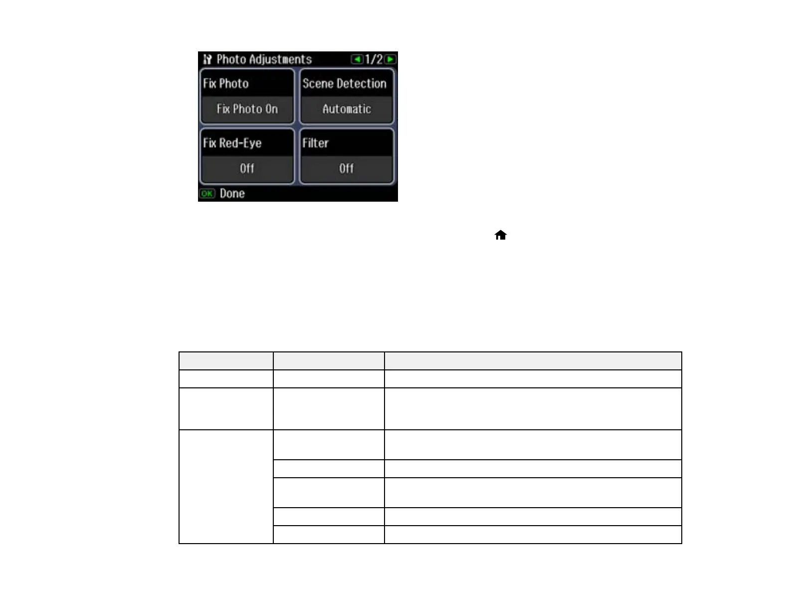 7. Select the photo adjustments you want to use, then press the Home button to exit.