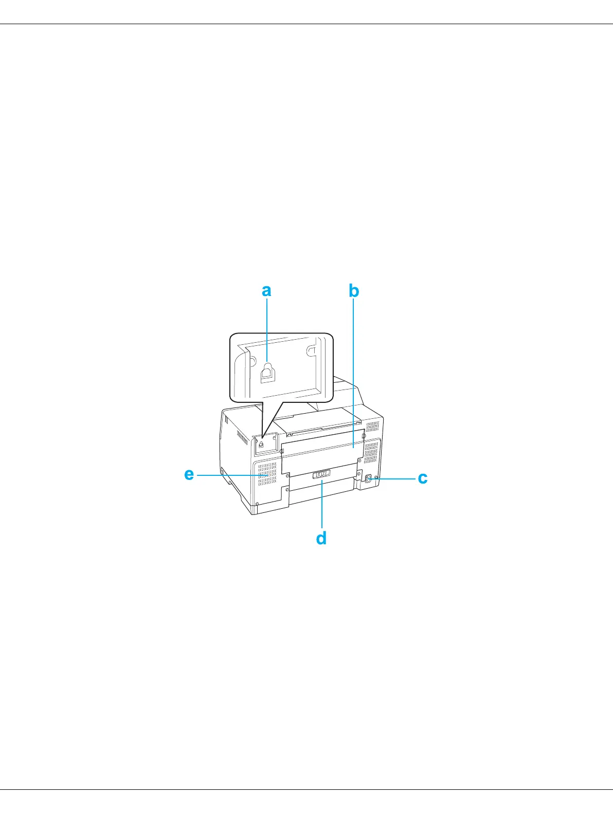 d. Lower rear printer cover: Covers the printing mechanism. Open only when paper jams.