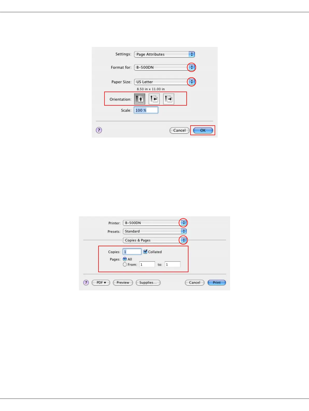 6. Select the printer you are using as the Printer setting. Then make the Copies & Pages