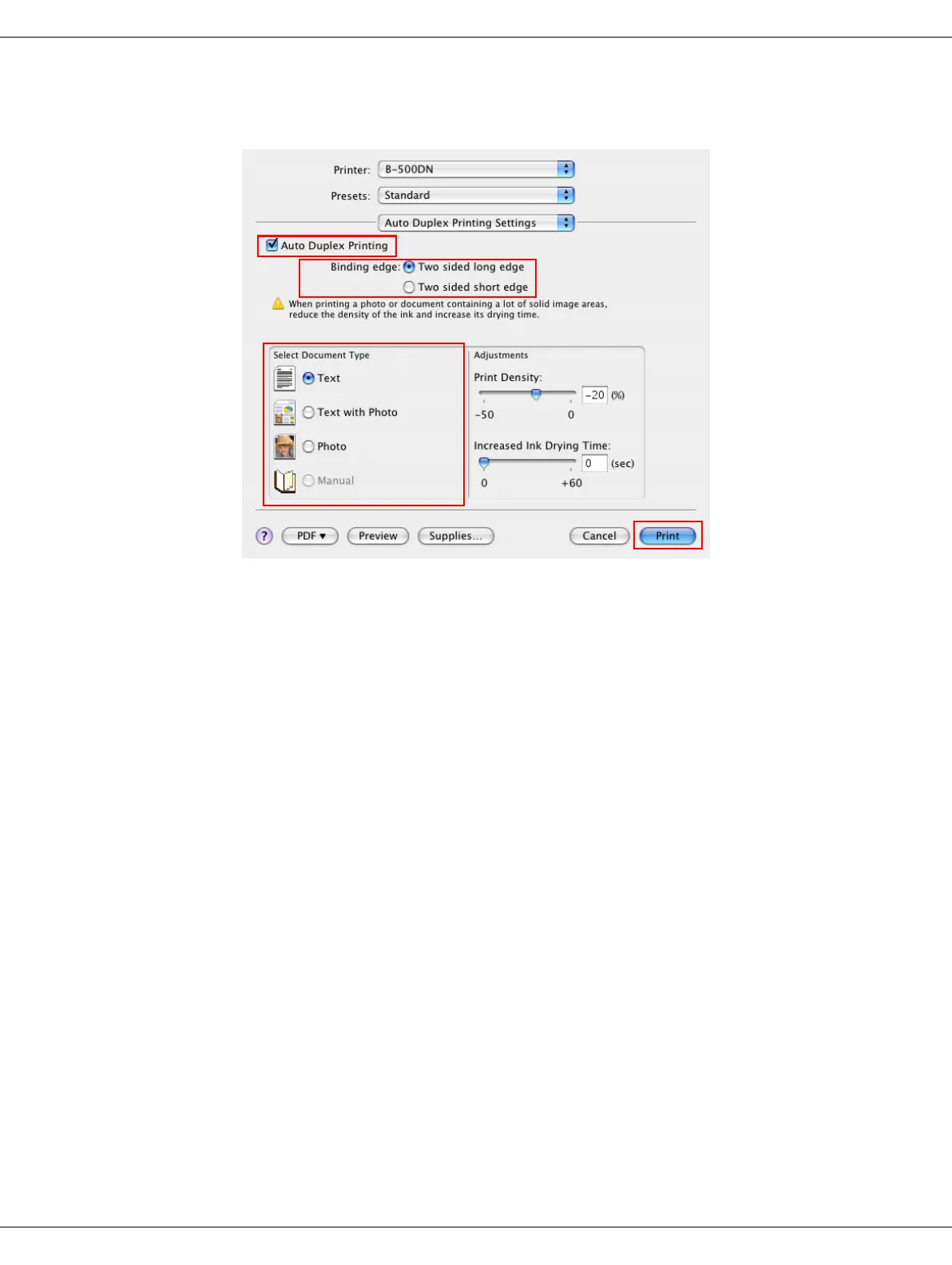 16.Select one of the Document Type settings. This automatically adjusts Print Density and