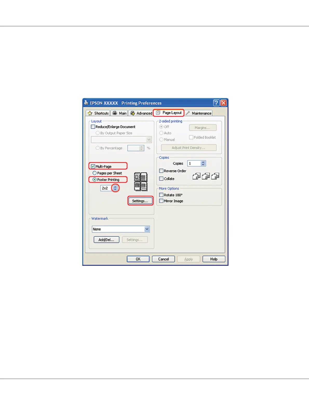 7. Click the Page Layout tab and select Multi-Page, then select Poster Printing. Click the up or