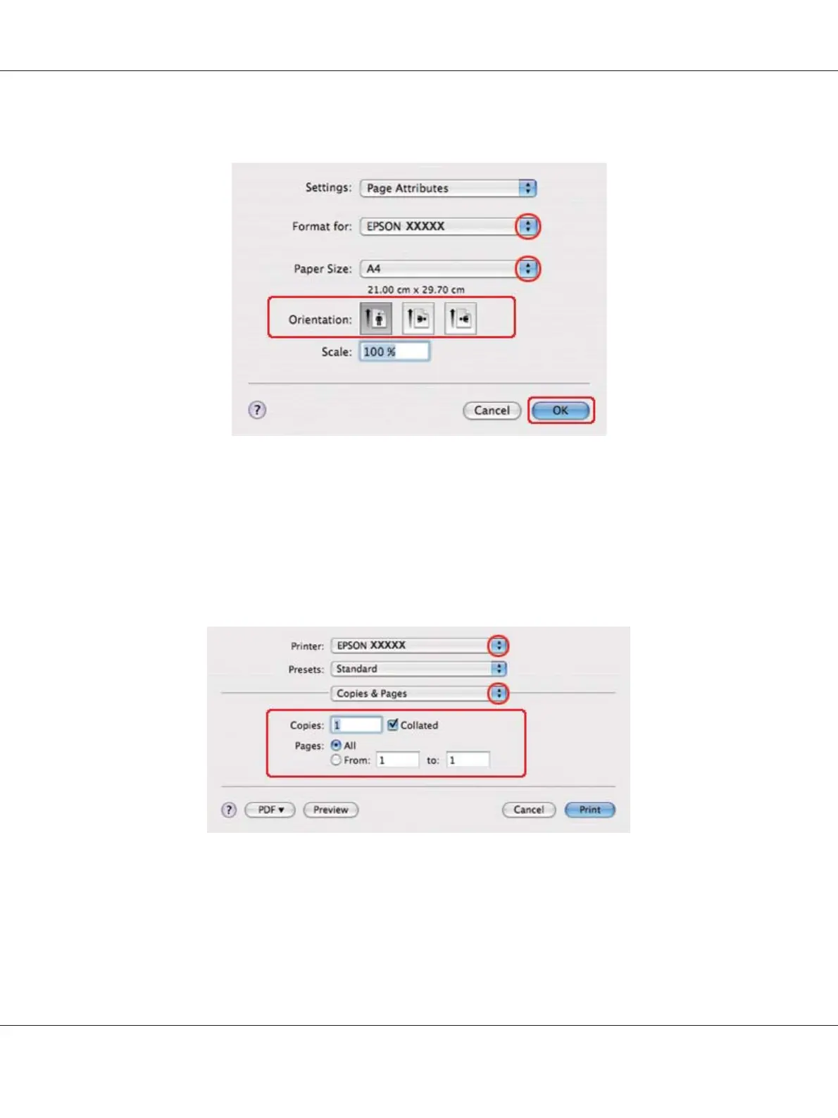 6. Select the printer you are using as the Printer setting. Then make the Copies & Pages settings.