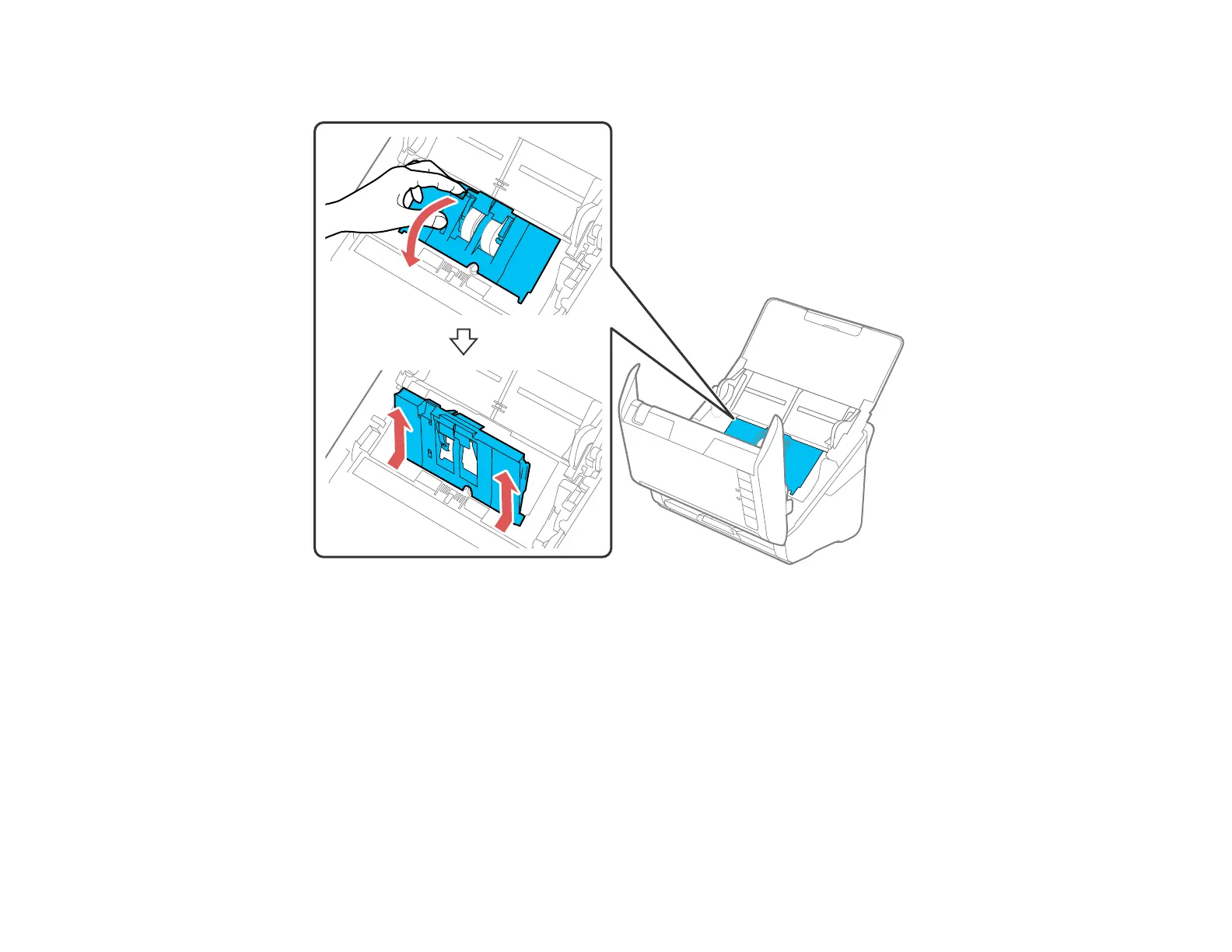 5. Press down on the pickup roller cover latch and pull up the cover to remove it.