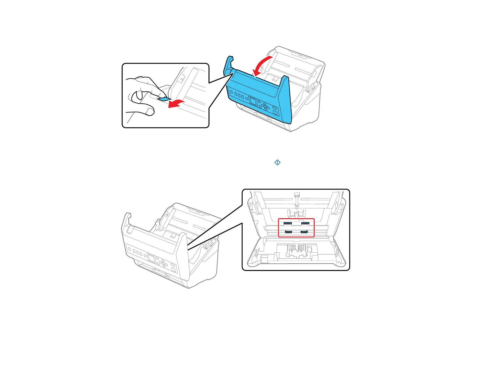 24. Slowly rotate the rollers shown here by pressing the start button. Use a genuine Epson cleaning