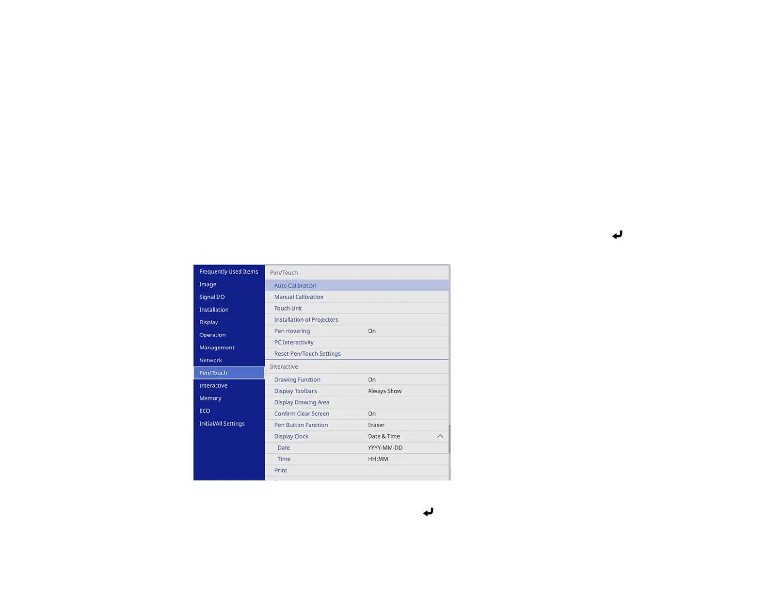 4. Press the Menu button on the remote control, select the Pen/Touch menu, and press the Enter