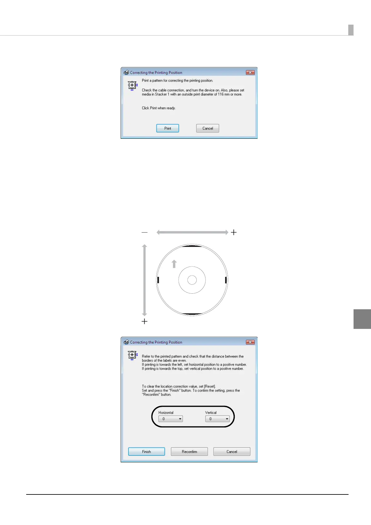 If the printing has shifted to the top: Select a positive correction value in [Vertical].