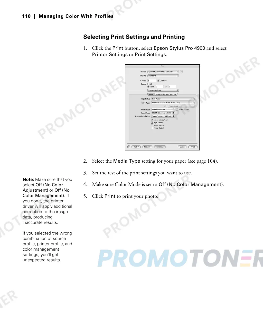 1. Click the Print button, select Epson Stylus Pro 4900 and select