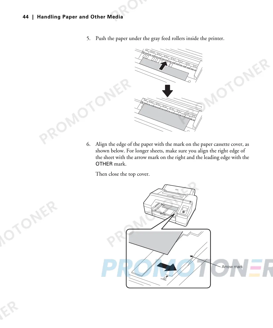 6. Align the edge of the paper with the mark on the paper cassette cover, as