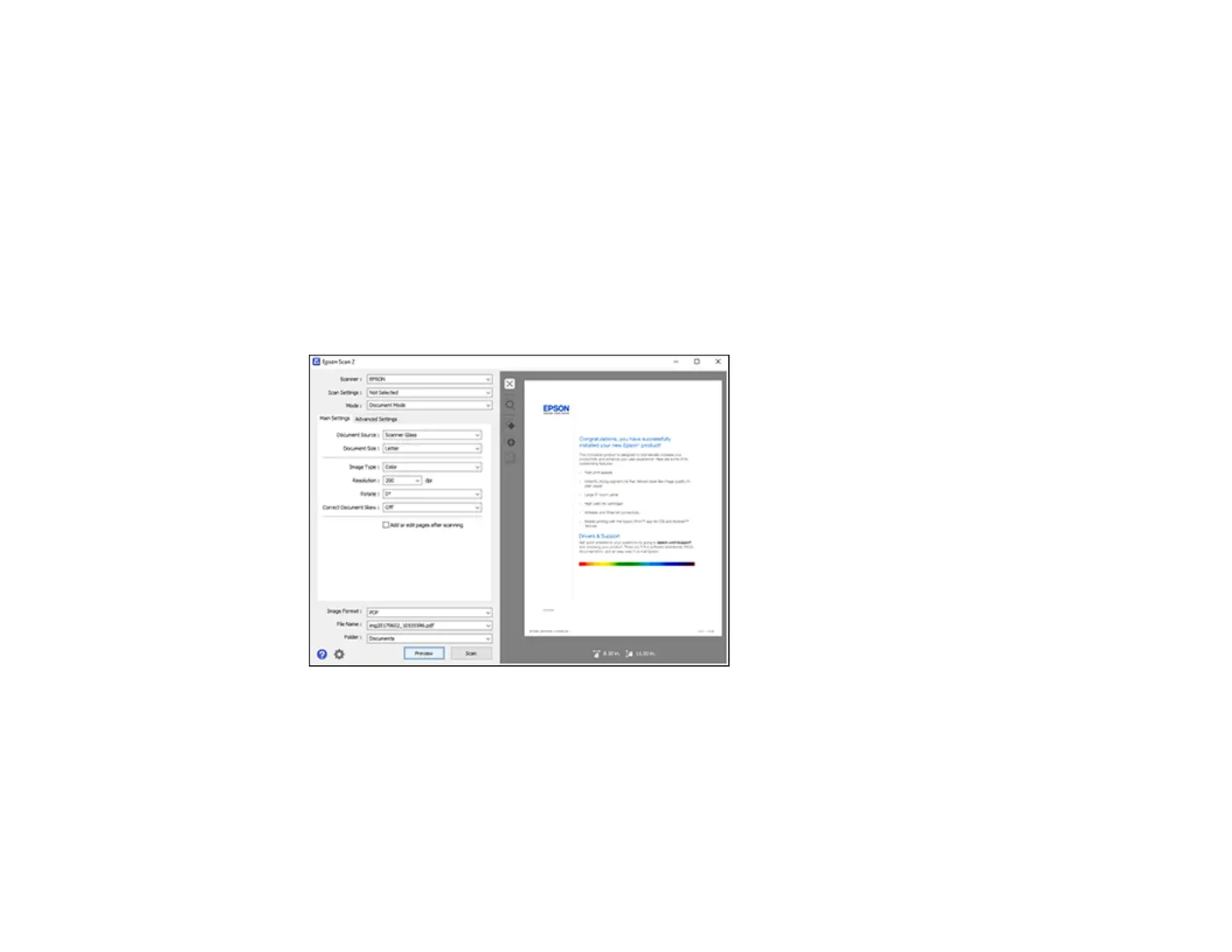 Epson Scan 2 previews your original and displays the results in the Epson Scan 2 window.