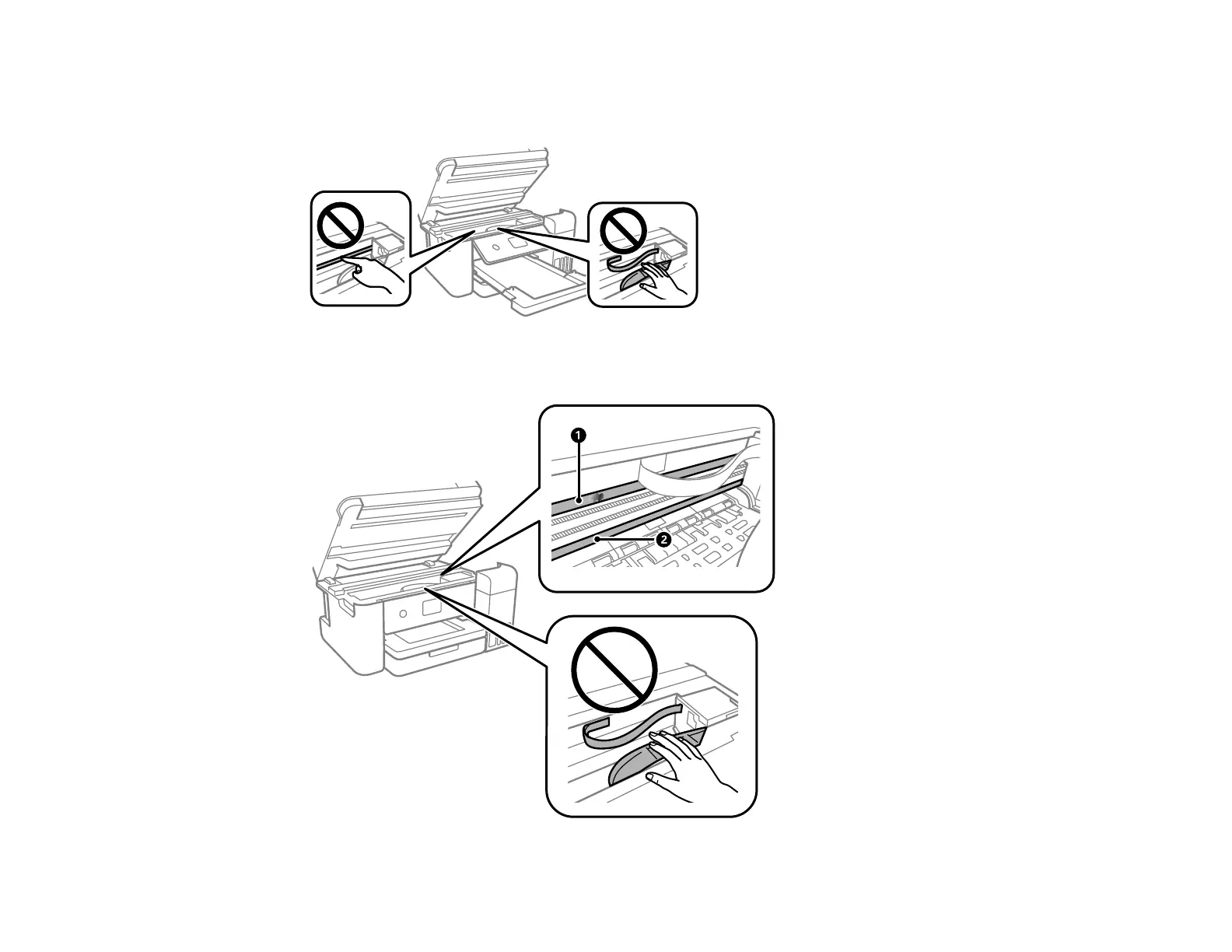 Caution: Do not touch the flat white cable, translucent film, or ink tubes inside the product. Doing so