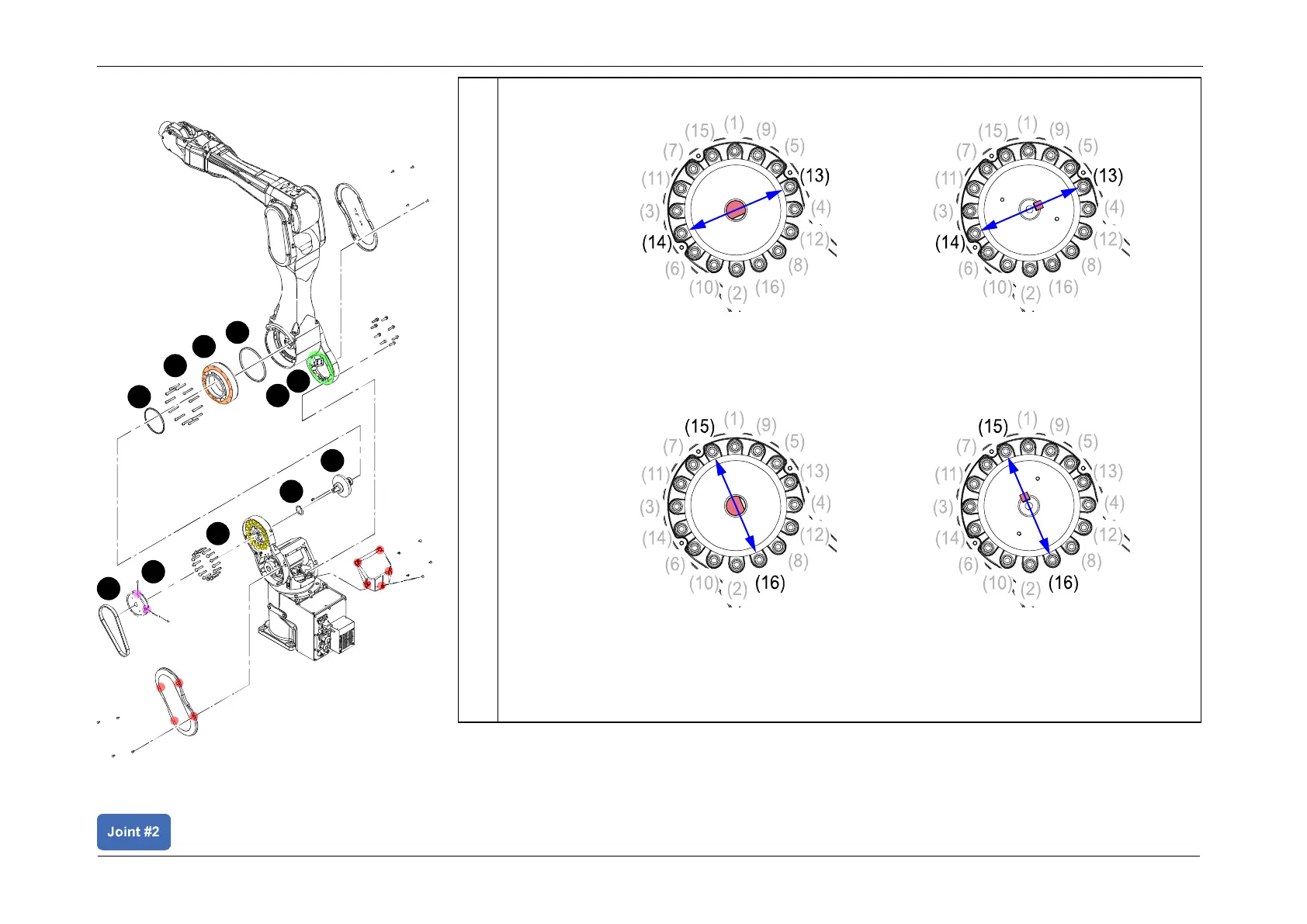 24. Tighten screws (15) and (16) to 40% and 100% of the torque value.