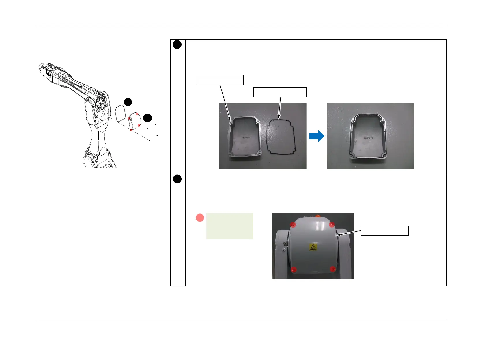 When installing the cover, be careful not to pinch the Rubber Gasket and cables. Also, do