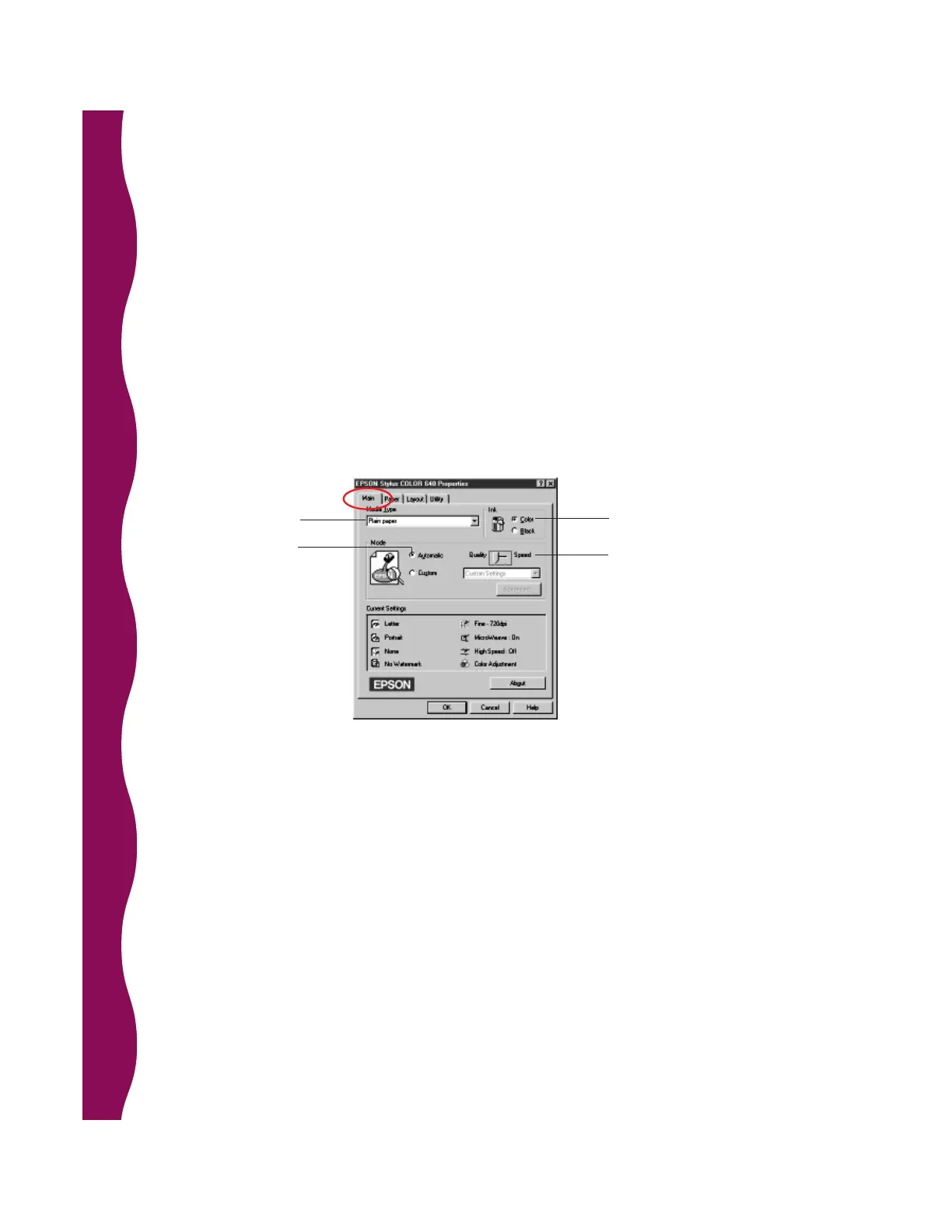7. You see your printer settings dialog box. If necessary, click the Main tab to