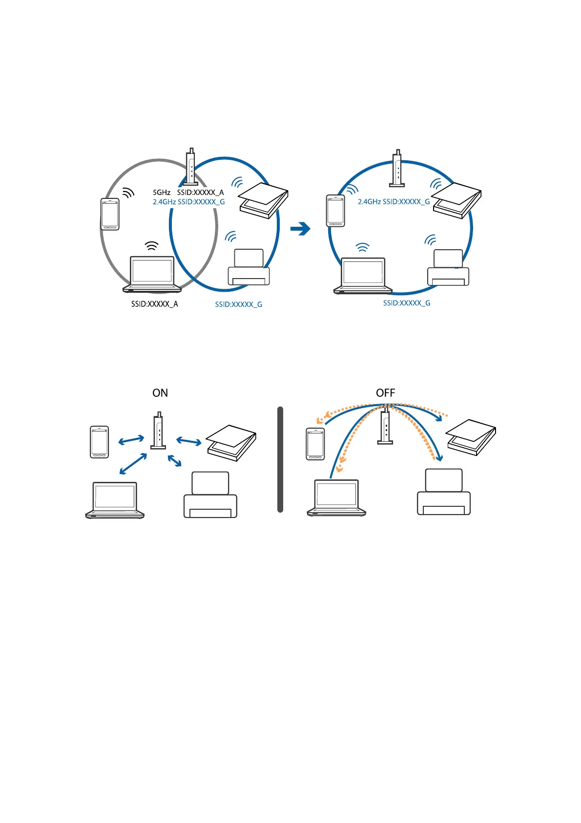 you connect the computer or smart device to a 5 GHz SSID, you cannot connect to the scanner because the