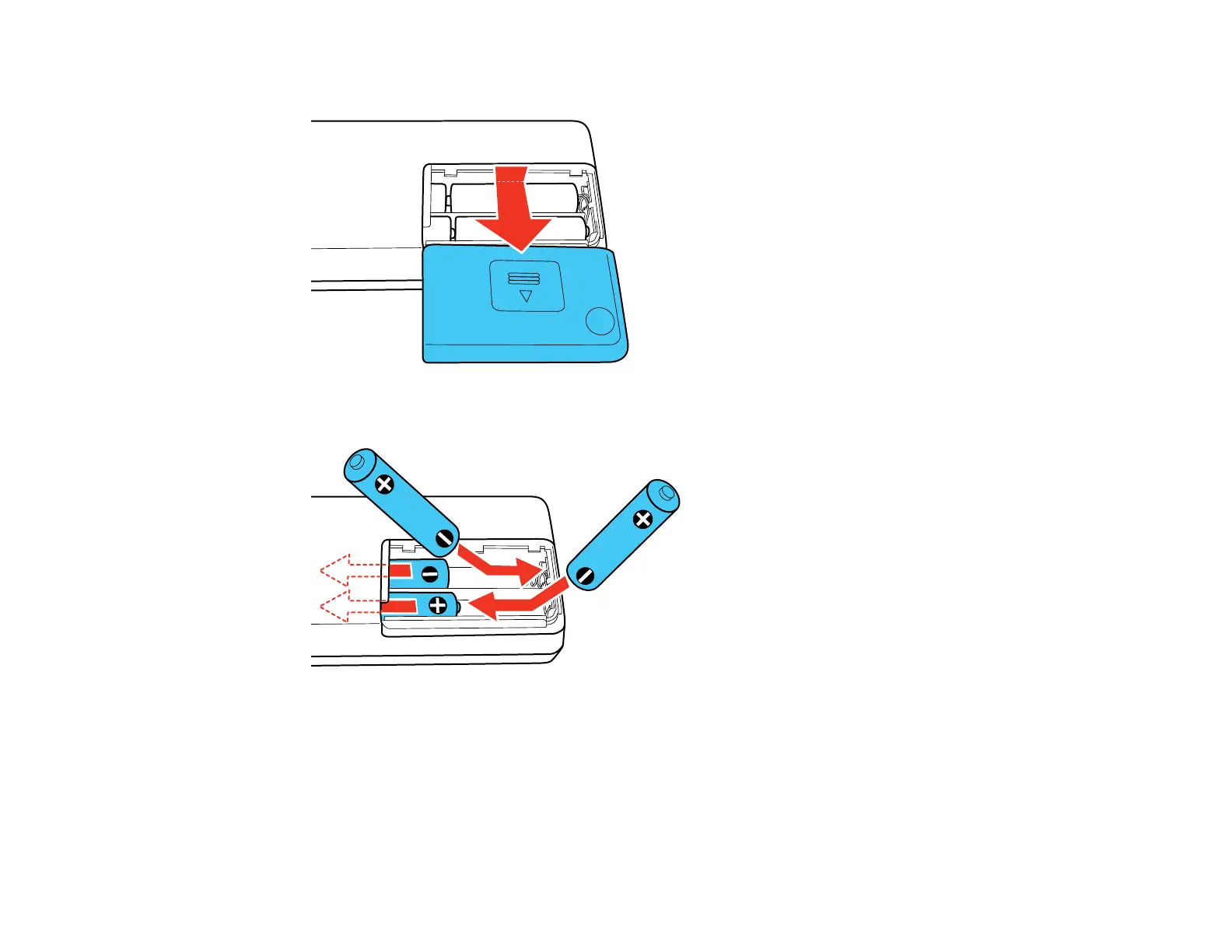 2. Insert the batteries with the + and ends facing as shown.