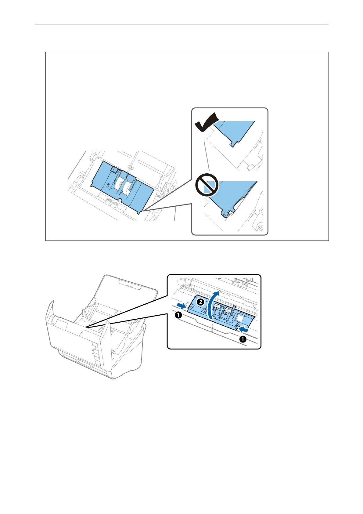 Push the hooks on both ends of the separation roller cover to open the cover.