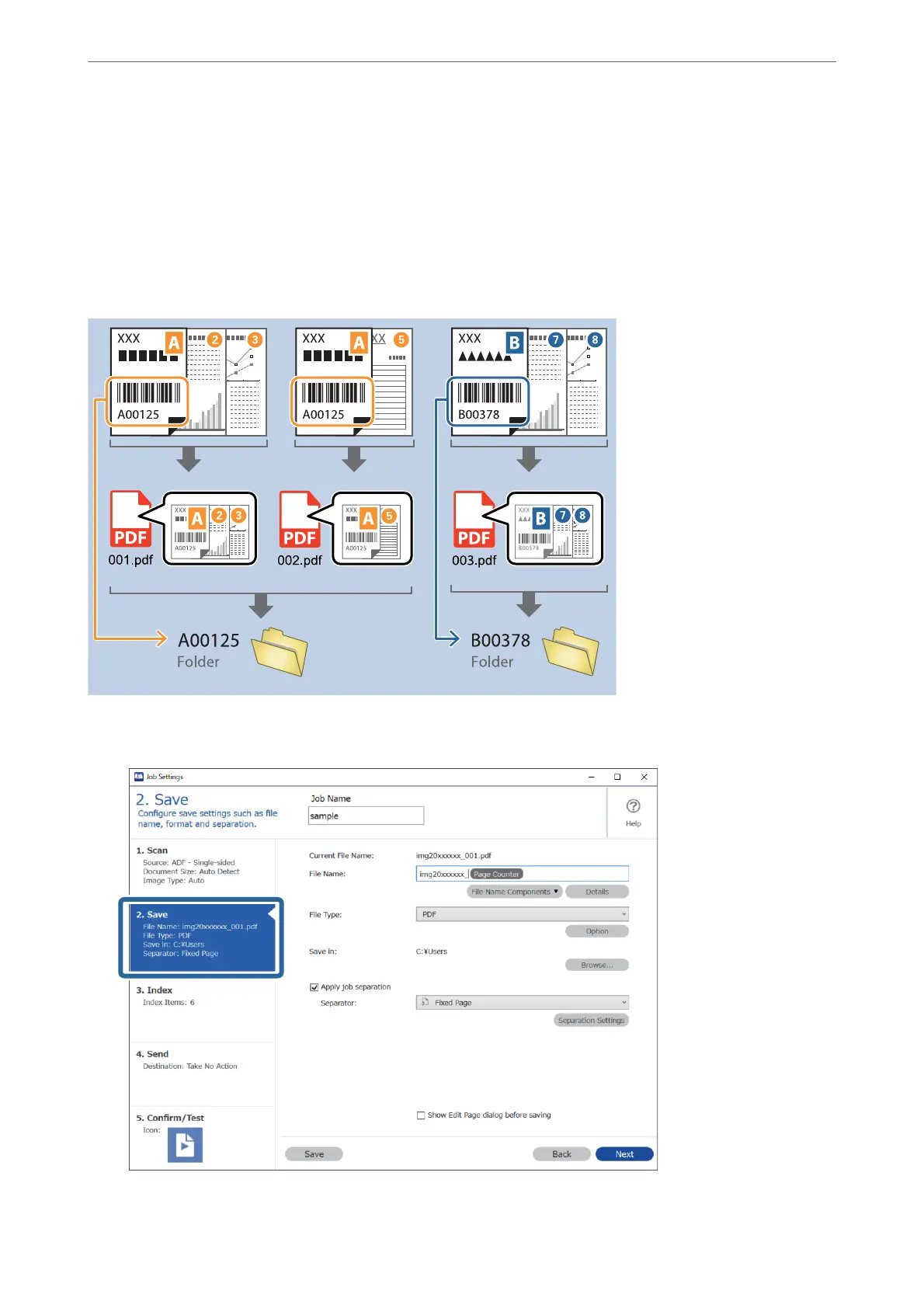 is section explains the job settings for "Sorting by barcode, and saving folder names using the text information