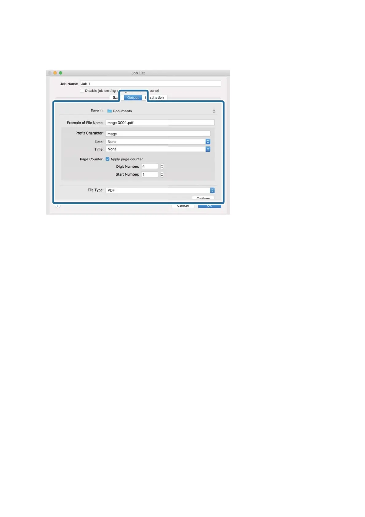 ❏ File Type: Select the save format from the list. Click Options to make detailed settings for the le.