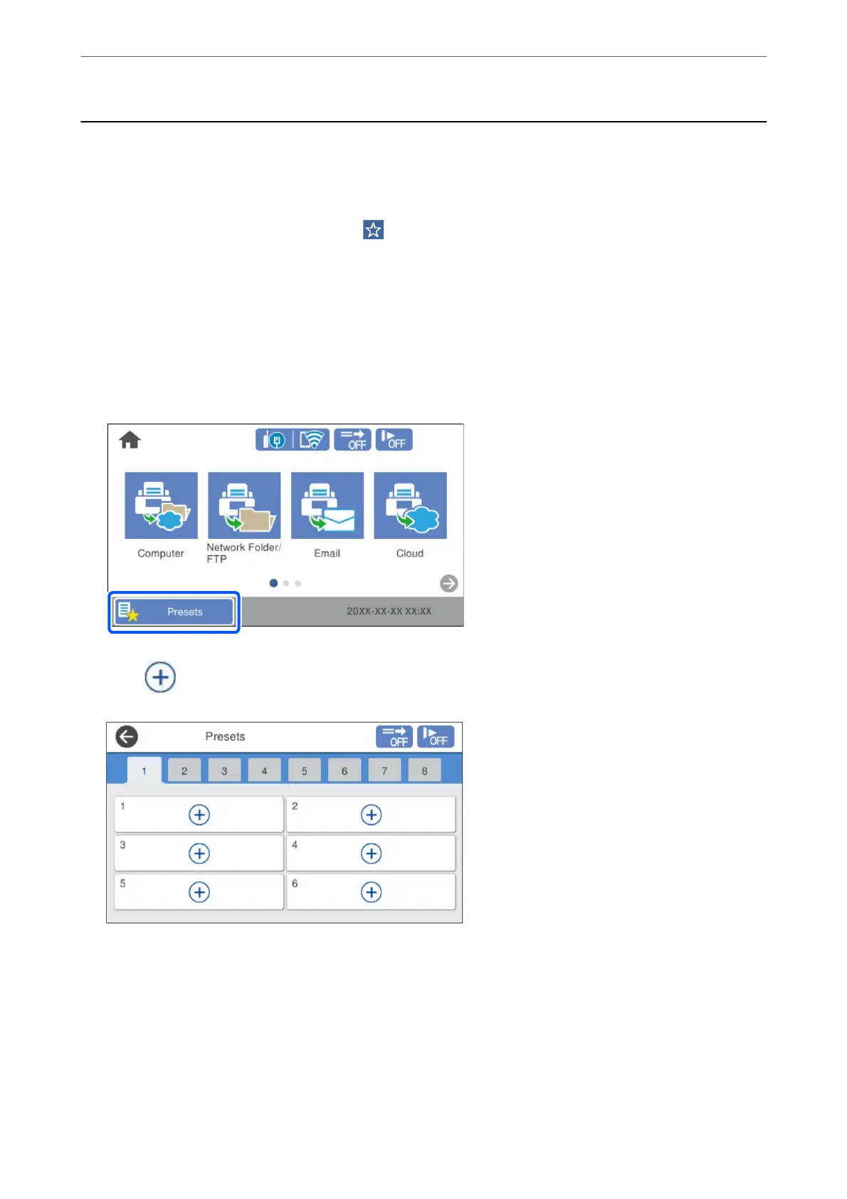 ❏ If the Lock Setting on the control panel is enabled, only the administrator can register Presets.