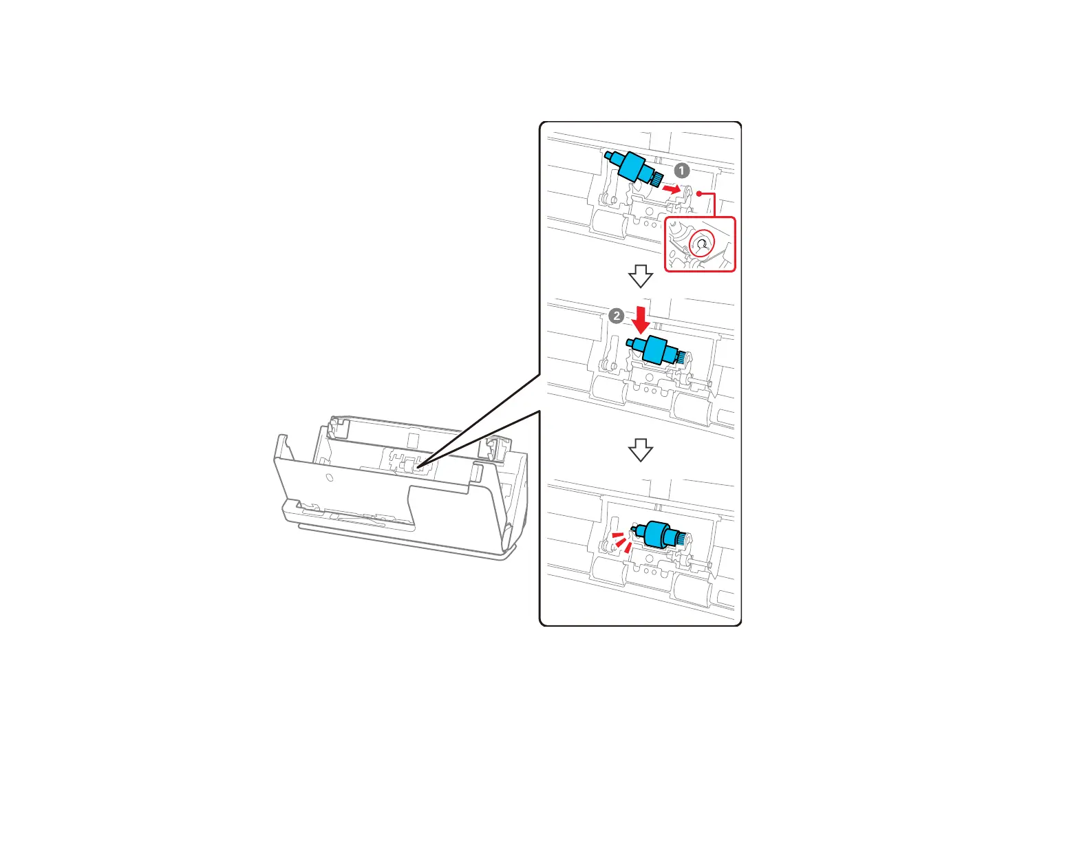 4. To install a new separation roller, insert the end of the roller into the hole on the right side and lower