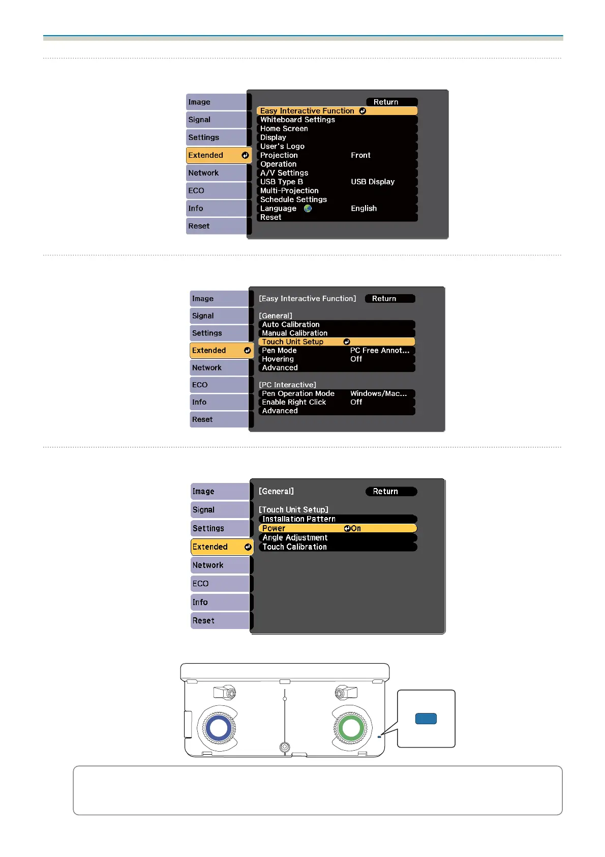 When Power is set to On, the next time the projector is turned on, the Touch Unit automatically