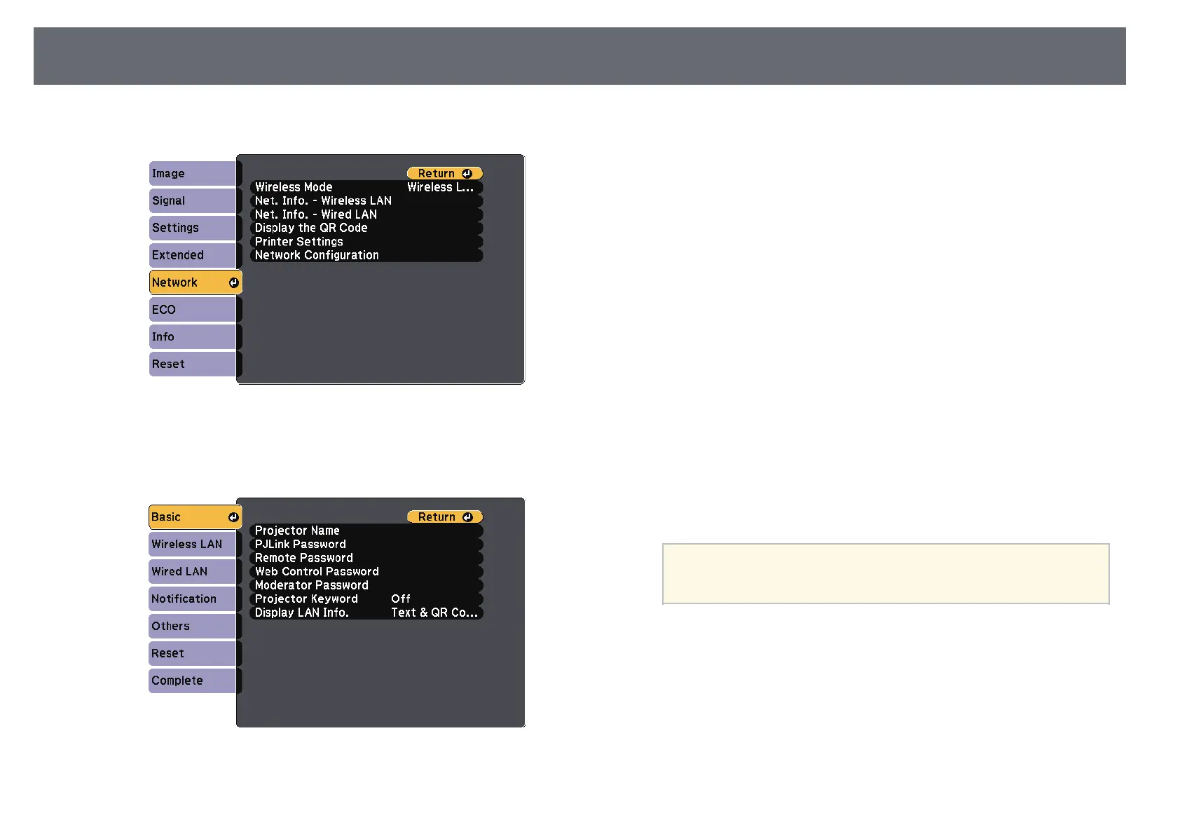 • PJLink Password lets you enter a password up to 32 alphanumeric